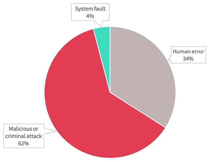 According to the Office of the Australian Commissioner’s (OAIC) Report the amount of breach notifications increased in the last reporting quarter to June 2019. Malicious or criminal attacks accounts for 62% of all breach notifications in that quarter whilst 34% were a direct result of human error.